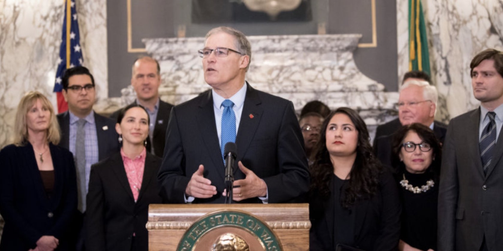 (Image: Novoselić, back row, 3rd from left. Jay Inslee press conference advocating the Washington Voting Rights Act. Novoselić testified in Olympia over various sessions in favor of the Act.)